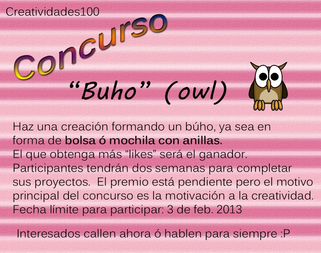 Amiguris: Hay dos concursos llevandose acabo ahorita: 1. Concurso en mi canal Creatividades100. Si gustan participar, sigan el enlace del video. Las bases estan ahi pero tambien se las incluyo: http://www.youtube.com/subscription_center?add_user=creatividades100 Las bases son:1. Ser subscriptor de mi canal2. Mayor de 18 años3. Dejar un comentario diciendo de qué país eres, edad y la frase […]