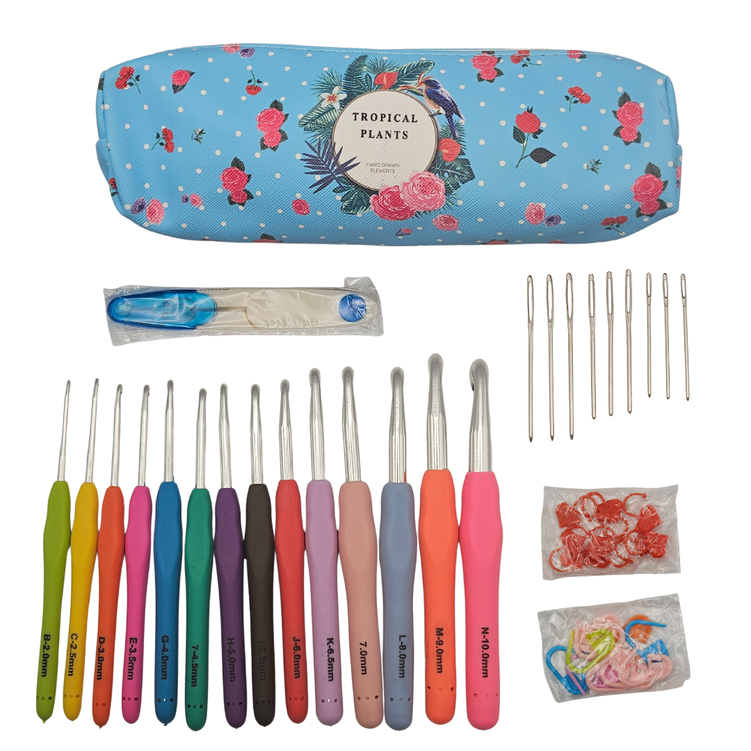 Contents: 14 Ergonomic Crochet Hooks, 9 Yarn Needles,10 Stitch Markers,1 Scissors & Case.